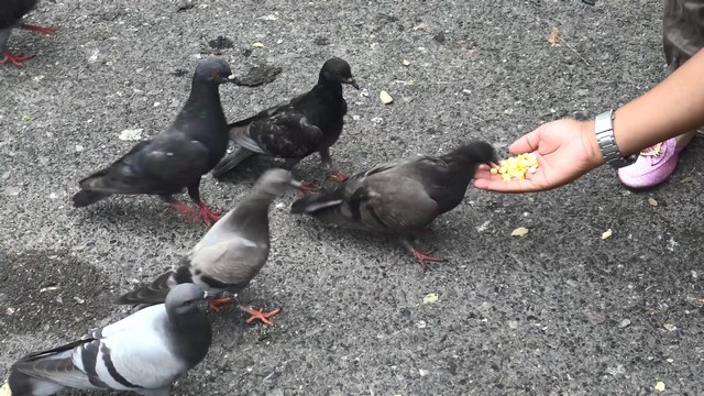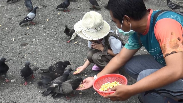 ในส่วนของนกพิราบ ก็มีพี่น้องชาวไทยมุสลิมจากจังหวัดชายแดนภาคใต้ นำบุตรหลาน ลงมาซื้อ ข้าวโพด ให้นกพิราบกิน อย่างมีความสุข เนื่องจากบรรยากาศแบบนี้ ที่อื่นไม่มี นกพิราบ มาจิกอาหารจากมือนักท่องเที่ยวกิน โดยไม่มีการบินหนีแต่อย่างใด ทำให้นักท่องเที่ยวมีความเพลิดเพลิน ซื้ออาหารให้นกพิราบกินอย่างต่อเนื่อง รวมทั้งถ่ายภาพกลับไปเป็นที่ระลึก เพื่อนำไปให้ ญาติพี่น้องได้เห็น ถึงความน่ารักของสัตว์ ที่บริเวณช่องเขาน้อย-เขาตังกวน เขตเทศบาลนครสงขลา จังหวัดสงขลา ที่มีลิงและนกพิราบ เป็นสัญลักษณ์ ของคนรักสัตว์ ที่บริเวณช่องเขาน้อยและช่องเขาตังกวนแห่งนี้