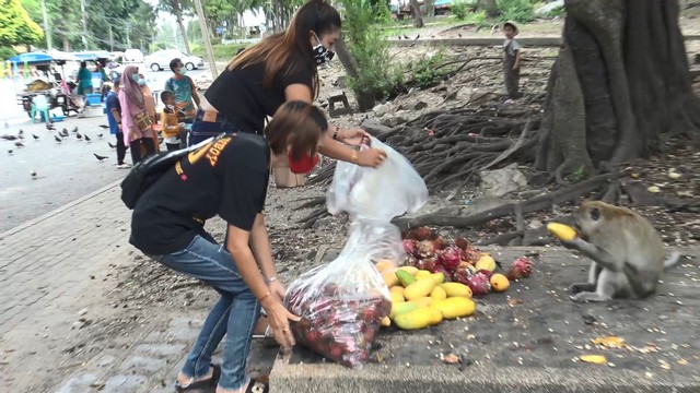 ในขณะเดียวกัน มีสองสาวใจบุญ ซื้อผลไม้ มีทั้งมะม่วง เงาะและแก้วมังกร ใส่ถุงขนาดใหญ่นำมาวางให้ลิงกิน เหมือนปาร์ตี้ผลไม้ย่อมๆ เนื่องจาก ที่ผ่านมาก็เคยนำผลไม้มาให้ลิงกินเป็นประจำ วันนี้ตั้งใจมาโดยซื้อมะม่วงเงาะและแก้วมังกร มาให้ลิงกินอีกครั้งหนึ่ง เนื่องจากเห็นว่า ช่วงนี้มะม่วงออกมาเยอะ ราคาไม่แพง รวมทั้งเป็นการอุดหนุนพ่อค้าแม่ค้าด้วย ลิงจะได้กินมะม่วง เงาะและแก้วมังกร แทนกล้วย ซึ่งที่ปกติลิงก็ได้กินกล้วยจากนักท่องเที่ยวทุกวันอยู่แล้ว