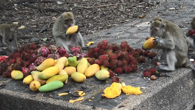 เมื่อมีผลไม้โปรดของลิงมาวาง ก็คือ มะม่วงสีเหลือง ฝูงลิงจะตรูเข้ามาหยิบมะม่วงกินทั้งมะม่วง ทั้งเงาะ สวนแก้วมังกรตั้งไว้ก่อน เนื่องจากมะม่วงเงาะกินง่ายกว่า โดยลิงจะปลอกเปลือกมะม่วงออกเหมือนคน กัดกินเนื้อมะม่วงส่วนเปลือกทิ้ง ลิงตัวเล็กและลิงตัวใหญ่ ปาร์ตี้ผลไม้กันอย่างสนุกสนานและอิ่มหนำสำราญไปทั่วหน้าทุกตัว