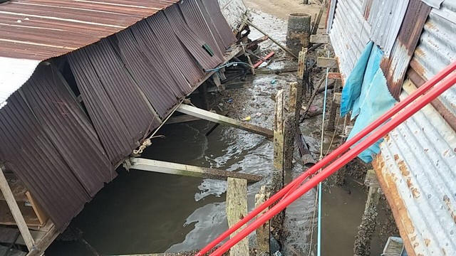 สอบถามผู้ที่อยู่ในเหตุการณ์ เล่าว่า ขณะเกิดเหตุเป็นช่วงน้ำลงและมีลมพัดกรรโชกแรงทำให้บ้านเรือนที่อยู่ในละแวกนั้นเกิดอาการสั่นคลอน ส่วนบ้านที่เกิดเหตุนั้นเนื่องจากยกตัวสูงพื้นด้านล่างก็เลยทรุดตัวพังคลืนลงในแม่น้ำทันที….