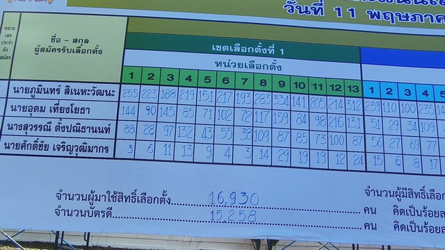 มุกดาหาร -ผลการนับคะแนนเลือกตั้งนายกเทศมนตรีเมืองมุกดาหาร (อย่างไม่เป็นทางการ) ภูมินทร์ ล้มแชมป์เก่าบ้านใหญ่เพื่อไทย
