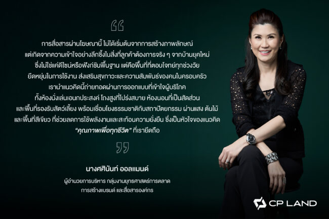 นางศศินันท์ ออลเเมนด์ ผู้อำนวยการบริหาร กลุ่มงานยุทธศาสตร์การตลาด การสร้างแบรนด์ และสื่อสารองค์กร กล่าวว่า การสื่อสารผ่านโฆษณาชุดนี้ไม่ได้เริ่มต้นจากการเน้นสร้างภาพลักษณ์ภายนอกแต่เป็นการถ่ายทอดแนวคิดที่เราเข้าใจอย่างลึกซึ้งถึงสิ่งที่ลูกค้าต้องการจากบ้านในปัจจุบัน จากการศึกษาพฤติกรรมผู้บริโภค เราพบว่า ความต้องการที่แท้จริงของผู้บริโภคไม่จำกัดแค่เรื่องดีไซน์หรือฟังก์ชันพื้นฐานเท่านั้นแต่ต้องการพื้นที่ที่รองรับทุกด้านของการใช้ชีวิตอย่างสมบูรณ์ ทั้งการใช้งานที่ตอบโจทย์ทุกวัย ความยืดหยุ่นในฟังก์ชันการใช้งาน และการสร้างบรรยากาศที่ส่งเสริมสุขภาวะและความสัมพันธ์ในครอบครัว โฆษณานี้จึงเป็นการนำแนวคิดเหล่านั้นมาถ่ายทอดผ่านการออกแบบที่เข้าใจผู้บริโภคจริงๆโดยการให้ความสำคัญกับฟังก์ชันการใช้งาน เช่น ห้องนั่งเล่นที่สามารถใช้ได้หลายกิจกรรมพื้นที่โถงสูงที่ระบายอากาศได้ดีและห้องนอนที่แยกเป็นสัดส่วนเพื่อรองรับความต้องการของสมาชิกหลายเจเนอเรชัน รวมถึงพื้นที่ที่รองรับการอยู่อาศัยของสัตว์เลี้ยง ซึ่งเป็นหนึ่งในเทรนด์ที่สำคัญในปัจจุบัน การสื่อสารในโฆษณาจึงไม่ใช่แค่การเน้นดีไซน์ แต่เป็นการเชื่อมโยงระหว่างธรรมชาติและสถาปัตยกรรม ผ่านแสงธรรมชาติ ต้นไม้ และ การออกแบบพื้นที่สีเขียวที่ช่วยลดการใช้พลังงาน พร้อมทั้งสะท้อนถึงความยั่งยืนในด้านสิ่งแวดล้อมที่เราให้ความสำคัญอย่างมาก