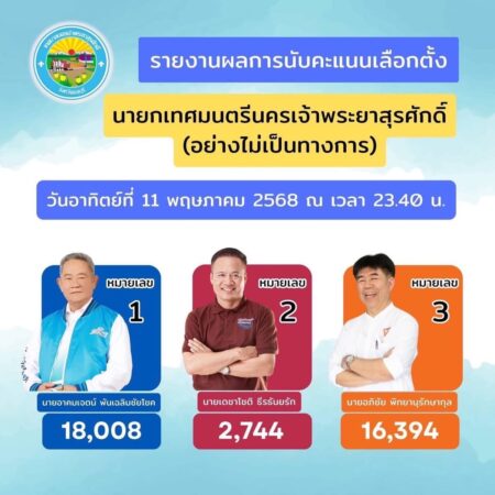 รายงานผลคะแนนเลือกตั้งอย่างไม่เป็นทางการของตำแหน่งนายกเทศมนตรีเทศบาลนครเจ้าพระยาสุรศักดิ์ จ.ชลบุรี อันดับ 1 คือ นายอาคมเจตน์ พันเฉลิมชัยโชค หรือนายกฮุ้น จากกลุ่มลูกเจ้าพระยา อดีตนายกเทศมนตรีเทศบาลนครเจ้าพระยาสุรศักดิ์ ได้รับความไว้วางใจจากพี่น้องชาวตำบลสุรศักดิ์ อำเภอศรีราชา จังหวัดชลบุรี ให้เป็นนายกเทศมนตรีอีกสมัย ส่วนสมาชิกจาก 24 ที่นั่ง พลาดไป 7 เก้าอี้ ให้พรรคประชาชน