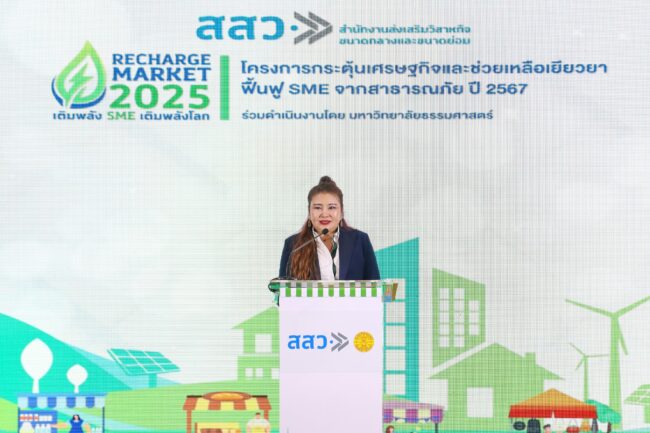 ดร.ปณิตา ชินวัตร รักษาการผู้อำนวยการสำนักงานส่งเสริมวิสาหกิจขนาดกลางและขนาดย่อม (สสว.) กล่าวว่า จากเหตุการณ์สาธารณภัยในปี 2567 ที่ผ่านมา เช่น ภัยน้ำท่วม ดินโคลนถล่ม และเหตุการณ์แผ่นดินไหวในปี 2568 ส่งผลกระทบต่อระบบเศรษฐกิจ และสร้างความเสียหายให้ผู้ประกอบการ และประชาชนในวงกว้าง ดังนั้น สสว. จึงได้ดำเนินโครงการกระตุ้นเศรษฐกิจและช่วยเหลือเยียวยาฟื้นฟู SME จากสาธารณภัย ปี 2567 ขึ้นโดยร่วมมือกับมหาวิทยาลัยธรรมศาสตร์ จัดงาน “ตลาดนัด รีชาร์จ ฟื้นฟู SME ไทย : Recharge Market 2025 เติมพลัง SME เติมพลังโลก” ระหว่างวันที่ 13-15 พ.ค. 2568 ซึ่งการดำเนินงานครั้งนี้เป็นไปตามนโยบายของรัฐบาลในการให้ความช่วยเหลือเยียวยา และบรรเทาผลกระทบจากสาธารณภัยในช่วงที่ผ่านมา รวมถึงกระตุ้นเศรษฐกิจในพื้นที่ ถือเป็นเวทีสำคัญที่จะเปิดโอกาสให้ผู้ประกอบการที่ได้รับผลกระทบจากสาธารณภัย และผู้ประกอบการที่ต้องการสร้างโอกาสทางการตลาดจากทั่วประเทศกว่า 300 ราย ได้มีพื้นที่ในการนำเสนอสินค้า บริการ และพบปะกับผู้บริโภคโดยตรงเพื่อสร้างรายได้ อีกทั้งยังเป็นการสร้างขวัญกำลังใจ และเติมพลังให้กับผู้ประกอบการในการดำเนินธุรกิจในภาวะที่มีการแข่งขันทางการตลาดสูงในปัจจุบัน รวมถึงผู้ประกอบการ SME ยังได้มีโอกาสเจรจาธุรกิจ เพิ่มช่องทางการขายกับรายใหญ่ ไม่ว่าจะเป็น 7-11 , CJ , Lotus , Tops , Big C, และ Max Values ซึ่งคาดว่าจะสามารถมูลค่าทางเศรษฐกิจได้กว่า 30 ล้านบาท