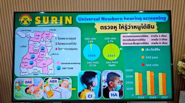 เพื่อตรวจคัดกรองการได้ยินในทารกแรกเกิดให้ได้รับการรักษาฟื้นฟูการได้ยินภายในอายุ 6 เดือน โดยในปี 2567 มีเด็กเกิดใหม่เข้ารับการตรวจคัดกรองการได้ยิน OAE ทุกราย 100% ตรวจไม่ผ่าน 1.85% ลดลงจากปี 2565 (3.92%) และเด็กที่ถูกตรวจพบความผิดปกติการได้ยินระดับก้านสมอง ได้รับการส่งต่อโรงพยาบาลราชวิถี และโรงพยาบาลศรีนครินทร์ มหาวิทยาลัยขอนแก่น เพื่อการรักษาต่อไป พญ.สมจินต์ จินดาวิจักษณ์ หัวหน้ากลุ่มศูนย์การแพทย์เฉพาะทางด้านโสต ศอ นาสิก โรงพยาบาลราชวิถี หัวหน้าคณะที่เดินทางมาให้ทำโครงการฯ กล่าวว่า ทารกแรกเกิดมีความสามารถทางการได้ยินระดับใด สามารถฟื้นฟูการได้ยินได้ แต่ถ้ามีการสูญเสียการได้ยินไปเลย ก็อาจต้องทำการผ่าตัดฝังประสาทหูเทียม ก็จะสามารถสื่อสารได้ใกล้เคียงกับคนปกติ เพราะทำให้มีการพัฒนาด้านการเรียนรู้ภาษาได้ใกล้เคียงกับคนปกติตั้งแต่เริ่มต้น ที่ถือเป็นปัจจัยสำคัญในการพัฒนาการเรียนรู้ตั้งแต่แรกเกิด