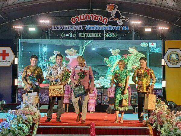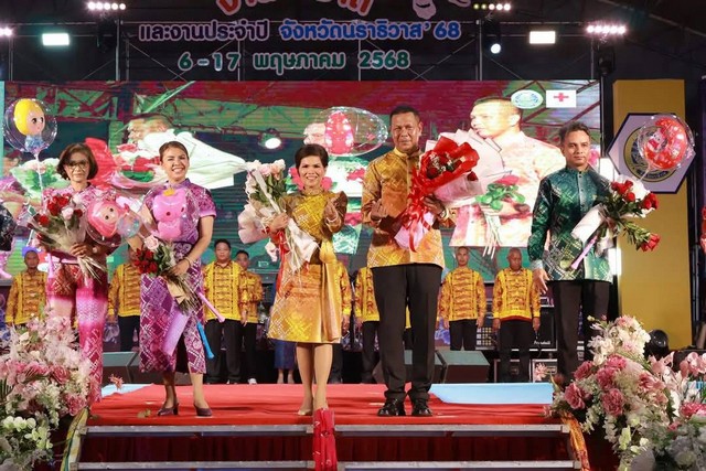 ผู้ว่าราชการจังหวัดนราธิวาส นำส่วนราชการเดินแบบแฟชั่นโชว์ผ้าลายพระราชทานผ้าลายอัตลักษณ์ของจังหวัดนราธิวาส ในชื่อชุด “เบญจแพรพรรณ เมอนารอ และผ้าทอศิลปาชีพ” 5 + 3 ผืนผ้า SOFT POWER NARATHIWAT 2025 เป็นคืนที่ 2 โดยมี นายวีรพัฒน์ บุณฑริก นายวิชาญ ชัยเศรษฐสัมพันธ์ และนายกฤษณนันท์ กำไร รองผู้ว่าราชการจังหวัดนราธิวาส