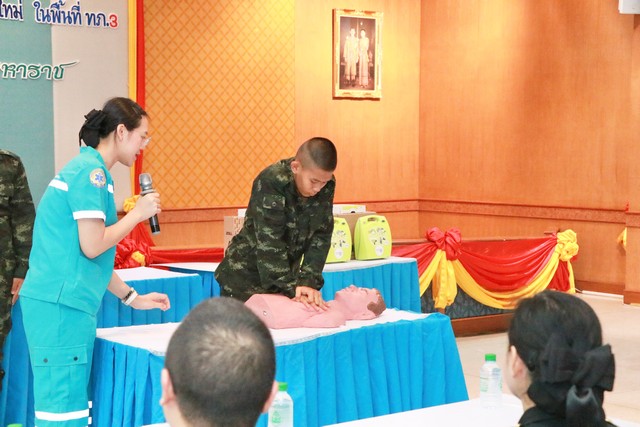 จากนั้นประธานสมาคมแม่บ้านทหารบก สาขากองทัพภาคที่ 3 ได้รับชมการสาธิตการใช้เครื่องกระตุกหัวใจด้วยไฟฟ้าแบบอัตโนมัติ (AED) พร้อมทั้งมอบแนวทางการใช้งาน และการเก็บรักษา ให้กับหน่วยฝึกทหารใหม่