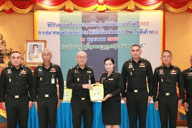 วันที่ 16 พฤษภาคม 2568 เวลา 10.00 นาฬิกา ที่ ห้องประชุมชินราชา ชั้น 3 อาคารอำนวยการ โรงพยาบาลค่ายสมเด็จพระนเรศวรมหาราช อำเภอเมือง จังหวัดพิษณุโลก พันเอกหญิง สุชาดา แจ่มสุวรรณ ประธานสมาคมแม่บ้านทหารบก สาขากองทัพภาคที่ 3 เป็นผู้แทนสมาคมแม่บ้านทหารบก มอบเครื่องกระตุกหัวใจด้วยไฟฟ้าแบบอัตโนมัติ (AED) ให้กับโรงพยาบาลค่ายสมเด็จพระนเรศวรมหาราช โดยมี พลตรี ปิยลาภ วสุวัต ผู้อำนวยการโรงพยาบาลค่ายสมเด็จพระนเรศวรมหาราช เป็นผู้รับมอบ