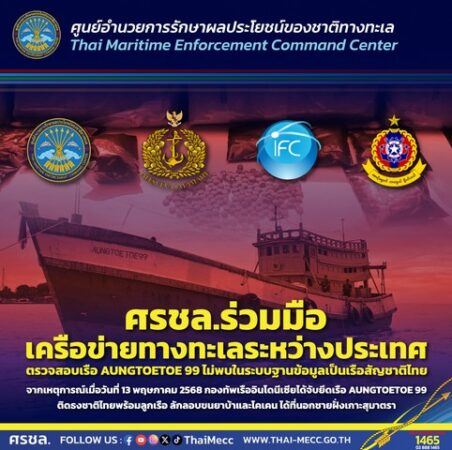 จากกรณี ข่าวการจับกุมยาเสพติดของ กองทัพเรืออินโดนีเซีย บนเรือประมงต่างชาติตามข่าวที่ปรากฏในสื่อออนไลน์นั้น ศูนย์อำนวยการรักษาผลประโยชน์ของชาติทางทะเล (ศรชล.) ได้ประสาน ศูนย์ข่าวสารทางทะเล ศูนย์ปฏิบัติการกองทัพเรือ แจ้งว่า ได้รับข่าวจาก สำนักงานผู้ช่วยทูตทหารเรือไทยในจาการ์ตา ว่า เมื่อวันที่ 13 พฤษภาคม 2568 กองทัพเรืออินโดนีเซีย ได้สกัดกั้นและจับกุมเรือประมงต่างชาติ ชื่อเรือ Aungtoetoe 99 (ตามข่าวอ้างว่าเป็นเรือไทย) ขณะแล่นอยู่ในน่านน้ำ Selat Durian ใกล้กับ Tanjung Balai Karimun จังหวัดหมู่เกาะเรียว โดยมีพฤติกรรมน่าสงสัยคือ ไม่มีอุปกรณ์จับปลาและไม่มีปลาบนเรือ