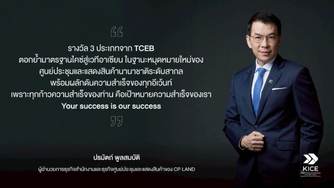 นายปรมัตถ์ พูลสมบัติ ผู้อำนวยการธุรกิจสำนักงานและธุรกิจศูนย์ประชุมและแสดงสินค้าของ CP LAND กล่าวว่า การได้รับการรับรองใน 3 ประเภทสำหรับศูนย์ประชุมและแสดงสินค้านานาชาติไคซ์ ขอนแก่น (KICE) ไม่เพียงสะท้อนถึงความพร้อมด้านโครงสร้างพื้นฐานและการให้บริการอย่างมืออาชีพเท่านั้น แต่ยังตอกย้ำถึงวิสัยทัศน์ของ CP LAND ในการยกระดับอุตสาหกรรมไมซ์ไทยสู่เวทีนานาชาติ ศูนย์ประชุมฯ ไคซ์ (KICE) ถือเป็นแลนด์มาร์กใหม่ของภาคตะวันออกเฉียงเหนือ และก้าวขึ้นสู่การเป็นศูนย์กลางการจัดกิจกรรมทางธุรกิจขนาดใหญ่ในระดับภูมิภาค ประเทศ และอาเซียน ด้วยขีดความสามารถที่ครบครัน ทั้งด้านพื้นที่ เทคโนโลยี การบริหารจัดการ และทำเลที่เชื่อมโยงได้ทั่วประเทศ จึงมีศักยภาพในการขับเคลื่อนอุตสาหกรรมไมซ์ไทยให้เติบโตอย่างแข็งแกร่ง ทุกอีเวนต์ที่เกิดขึ้น ณ ศูนย์ประชุมฯ ไคซ์ (KICE) สะท้อนมาตรฐานที่ทันสมัยและความใส่ใจในทุกรายละเอียด พร้อมส่งมอบประสบการณ์ที่มีประสิทธิภาพ คุ้มค่า และนำไปสู่ผลลัพธ์ที่ยั่งยืน ทั้งสำหรับผู้จัด ผู้ร่วมงาน และชุมชนโดยรอบ อีกทั้งยังมีบทบาทสำคัญในการผลักดันขอนแก่นสู่การเป็นศูนย์กลางเศรษฐกิจแห่งใหม่ของภูมิภาค