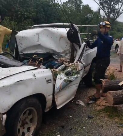 โดย สภาพศีรษะถูกทับ ส่วนลูกสาวอยู่ในแคปด้านหลังคนขับบาดเจ็บไม่มาก ก่อนเกิดเหตุ 3คนพ่อแม่ลูกเดินทางอกจากบ้านเพื่อที่จะไปเยี่ยมญาติที่ป่วยอยู่ที่ โรงพยาบาลนิคมคำสร้อย โดยคาดว่าระว่างขับรถมาต้นไม้ได้ล้มลงมาพอดีจึงทำให้ทับลงบริเวณห้องคนขับด้านหน้าทำให้ นาย สุพจน์ ภูมิลา อายุ 54 ปี และ นางทองเลข ภูมิลา อายุ 49 ปี ทำให้เสียชีวิตทันที่ ส่วนลุกสาวอายุ 16 ปี ถูกนำส่งโรงพยาบาล
