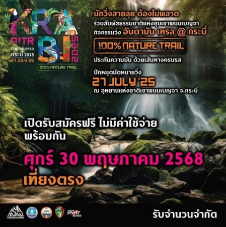 สำหรับการแข่งขัน อันดามัน เทรล กระบี่ จะจัดขึ้น ณ อุทยานแห่งชาติเขาพนมเบญจา อำเภอเมืองกระบี่ จังหวัดกระบี่ ระหว่างวันที่ 26-27 กรกฏาคม 2568 โดยจัดการแข่งขันใน 4 ระยะ ได้แก่ ระยะ 7 กิโลเมตร/15 กิโลเมตร/25 กิโลเมตร และ 40 กิโลเมตร แยกประเภทการแข่งขัน ชาย-หญิง พร้อมโล่และเงินรางวัล โดยเปิดรับสมัครผู้ร่วมกิจกรรมฟรีไม่มีค่าใช้จ่าย ในวันศุกร์ที่ 30 พฤษภาคม 2568 ตั้งแต่เวลา 12.00 น. รับจำนวนจำกัด ผู้สนใจสามารถติดตามรายละเอียดเพิ่มเติมได้ที่ FB :Andaman Tail Krabi หรือ FB : Thailand Sport Series