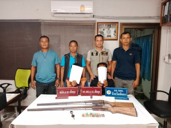 พร้อมของกลางปืนลูกซองยาวเดี่ยว 2 กระบอก กระสุนปืนลูกซอง ขนาดเบอร์ 12 จำนวน 11 นัด อุปกรณ์เสพยาบ้า 1 ชุด