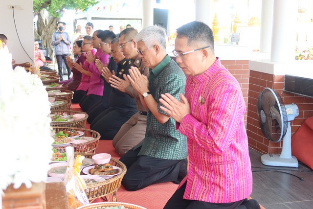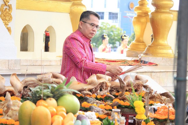 วันนี้ (28 พฤษภาคม 2568) เวลา 07.00 น.นายสุวรรธณ์ เข็มธนเพ็ชร รองผู้ว่าราชการจังหวัดร้อยเอ็ดเป็นประธานในพิธีงานบุญเบิกบ้าน(บุญซำฮะ)และสักการะศาลเจ้าพ่อหลักเมือง ประจำปี 2568 ณ ศาลเจ้าพ่อหลักเมือง เกาะกลางบึงพลาญชัย ภายในบึงพลาญชัย อำเภอเมือง จังหวัดร้อยเอ็ด โดยนำหัวหน้าส่วนราชการ ข้าราชการ ส่วนเกี่ยวข้องร่วมสักการะศาลเจ้าพ่อหลักเมือง ด้วยการจุดธูปเทียน ถวายพวงมาลัย ดอกไม้สักการะ เครื่องเซ่นไหว้ พร้อมรำอวยพร