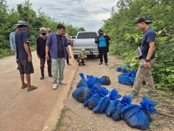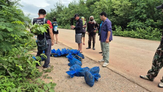 วันที่ 31 พฤษภาคม 2568 นายศิริกูร สังข์ตะคุ หัวหน้าเขตห้ามล่าสัตว์ป่าเขาประทับช้าง อ.จอมบึง จ.ราชบุรี ได้รับแจ้งจากผู้นำชุมชนในต.หินกอง อ.เมือง จ.ราชบุรี ว่าพบลิงแสมถูกใส่งถุงตาข่ายมาแขวนไว้ในป่าบริเวณหมู่ 1 ต.หินกอง และไม่ทราบว่าใครเป็นเจ้าของ จึงนำกำลังเจ้าหน้าที่ไปตรวจสอบ พบว่าบริเวณที่พบลิงนั้นต้องเดินมุดเข้าไปในป่าห่างจากถนนเข้าประมาณ 200 เมตร ด้านในพบถุงตาข่ายสีฟ้า ซึ่งบรรจุลูกลิงแสมไว้ถุงละ 1 ตัวบ้าง บางถุงก็มี 2-3 ตัว นับได้ทั้งหมด 25 ตัว ส่งเสียงร้องและดิ้นอยู่ถุงอย่างน่าเวทนา นอกจากที่บริเวณที่พื้นดินพบสายเคเบิลไทร์สำหรับรัดปากถุงซึ่งบางอันก็ถูกตัดบางอันก็ยังไม่ถูกตัดหล่นอยู่ตามพื้นจำนวนมาก เจ้าหน้าต้องช่วยกันนำถุงที่ใส่ลูกออกมาด้านนอกและพบว่าในถุงนั้นจะมีอาหารเช่นมันแกว และผลไม้อยู่ในแต่ละถุงคาดว่าน่าจะให้ลูกลิงไว้กิน