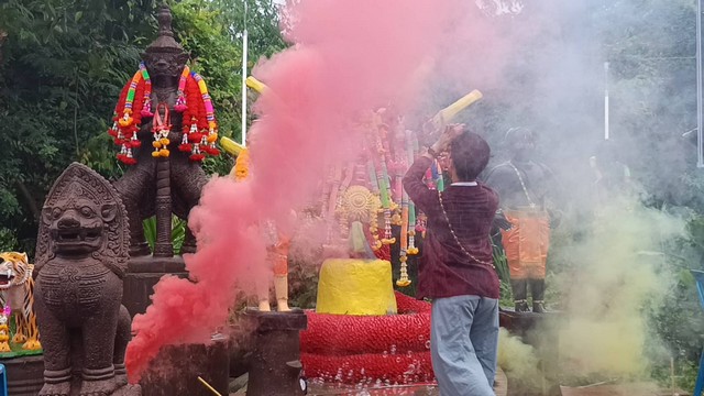 ซึ่งในวันนี้ เป็นช่วงสัปดาห์แรกของเดือน ตนจึงได้จัดพิธีบวงสรวงด้วยเครื่องสักการะต่างๆอย่างครบครันพร้อมด้วยรูปปั้นท้าวเวสสุวรรณและพ่อปู่ฤาษีตาไฟ ที่แกะสลักด้วยหินศิลาแลง มาประกอบพิธีบวงสรวงและแก้บนดังกล่าว โดยมีลูกศิษย์ของสำนักสักยันต์ไทย อ.เอิ้น สมิงกินคน อุตรดิตถ์ พร้อมด้วยชาวบ้านในพื้นที่ มาร่วมพิธีดังกล่าวจำนวนมาก