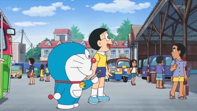 .ล่าสุดผู้สื่อข่าวจึงได้เดินทางไปตามลอยการ์ตูนโดราเอมอน และ โนบิตะ ตามที่ปรากฎฉากในภาพ ซึ่งจุดแรก เป็นซุ้มประตูทางเข้าตลาดน้ำดำเนินสะดวก และ ข้ามคลองดำเนินสะดวก จนมาถึงท่าเรือยุวันดา ตรงกับในฉากของการ์ตูนโดราเอมอน พบกับ นางยุวันดา อุรุพงศา อายุ 74 ปี เจ้าของเรือยุวันดา พร้อมกับเปิดใจกับผู้สื่อข่าวว่า ตนในฐานะเจ้าของท่าเรือบุวันดา และ ชาวดำเนินสะดวกรู้สึกดีใจที่ทางผู้สร้างได้นำตลาดน้ำดำเนินที่เป็นแหล่งท่องเที่ยวอันซีนของโลกอีกแห่งหนึ่ง มีนักท่องเที่ยวทั้งชาวไทย และ ชาวต่างชาติเดินทางมาเที่ยวชมอย่างต่อเนื่อง ทั้งนี้หลังจากเกิดแผ่นดินไหว ทำให้ยอดนักท่องเที่ยวลดไปมาก โดยเฉพาะนักท่องเที่ยวชาวจีนก็หดหายไป ซึ่งตนจึงมีความหวังว่า หลังจากที่ทางการ์ตูนโดราเอมอนได้เผยแพร่ไป จะมีนักท่องเที่ยวมาเที่ยวเพิ่มมากขึ้น