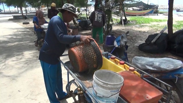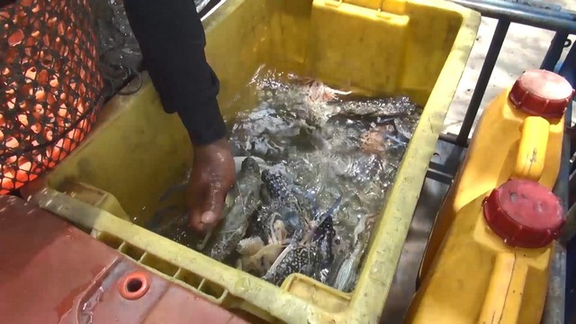 นายดลเหล๊าะหมาน หมัดเส็น วัย 45 ปี ชาวประมงอวนปูชุมชนบ้านบ่ออิฐ ต.เกาะแต้ว อ.เมือง จ.สงขลา บอกว่า วันนี้ได้นำเรือออกไปวางอวนปูม้า ตั้งแต่ประมาณตีสาม โดยวิ่งเรือออกไปประมาณเกือบชั่วโมงจากฝั่ง ระยะทางประมาณ 5- 6 กิโลเมตร เพื่อไปวางอวนปู หลังจากนั้นก็จะกลับเข้าฝั่งในช่วงเช้า วันนี้ได้ปูม้าประมาณ 5 – 6 กิโลกรัม ทั้งตัวใหญ่และตัวเล็ก ทั้งตัวผู้ตัวเมีย โดยทำการแกะปูม้าออกจากอวนบนเรือและใส่ในท้องเรือที่ใส่น้ำเตรียมไว้ เพื่อไม่ให้ปูตาย เมื่อถึงฝั่งก็นำไปใส่ถุงตาข่ายไปแช่น้ำในทะเล เพื่อให้ปูอยู่ในน้ำและยังมีชีวิต เพราะปูม้าจะต้องขายปูเป็นๆ จึงจะได้ราคาดี