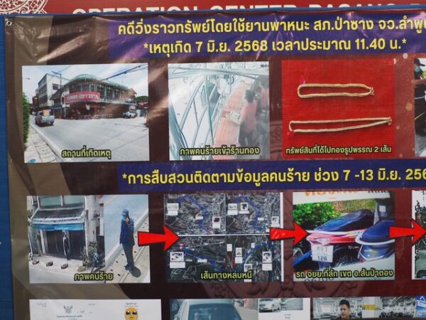 ด้วยเมื่อวันที่ 7 มิถุนายน 2568เวลาประมาณ 11.40 น.ได้รับแจ้งว่ามีเหตุวิ่งราวทรัพย์ที่ร้านทองเยาวราช แยกตลาดป่าซาง ม.1 ต.ป่าซาง อ.ป่าซาง จ.ลำพูน พ.ต.อ.วีรชาติ ระตะเจริญ ผกก.สภ.ป่าซาง,พ.ต.ท.ชาญวิทย์ ทนันชัย รอง ผกก.สส.สภ. อ.ป่าซาง, พ.ต.ท กฤตธัช ศรีคำมูล สว.สส.สภ.ป่าซาง พร้อมด้วยชุดสืบสวน สภ.ป่าซาง จว.ลำพูน และพนักงานสอบสวนเดินทางไปตรวจสอบที่เกิดเหตุพบว่าคนร้ายได้วิ่งราวทรัพย์เป็นทองรูปพรรณจำนวน 2 เส้น น้ำหนักเส้นละ 5 บาท มูลค่าประมาณ 500,000 กว่าบาท จึงได้ ประสาน พฐ.จังหวัดลำพูน ร่วมตรวจสอบสถานที่เกิดเหตุและตรวจยึดหลักฐานที่คนร้ายทิ้งไว้ในที่เกิดเหตุไว้เป็นหลักฐาน