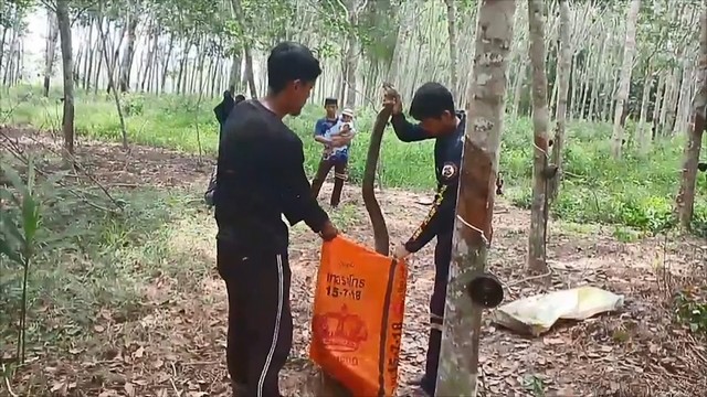 เจ้าหน้าที่เมื่อไปถึงสวนยางพาราของนางติเมาะฯก็พบงูจงอางตัวใหญ่กำลังกินงูสิงหางลายอยู่ จึงนำอุปกรณ์ในการจับงูเข้าทำการจับงูจงอางทันที แต่งูจงอางชูคอฉกสู้อย่างดุร้าย แต่เจ้าหน้าที่ก็ใช้ความพยายามและระมัดระวังจนจับงูจงอางไว้ได้นำมาวัดได้ความยาว 3.50 เมตร จึงนำใส่กระสอบเตรียมนำไปปล่อยคืนสู่ป่าธรรมชาติที่อยู่ห่างไกลบ้านเรือน เพื่อความปลอดภัย
