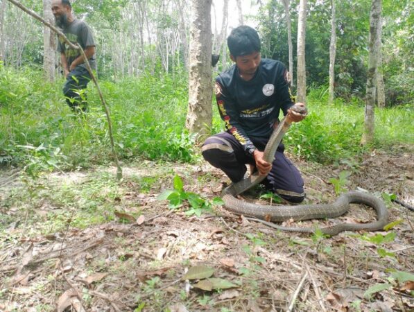 เจ้าหน้าที่เมื่อไปถึงสวนยางพาราของนางติเมาะฯก็พบงูจงอางตัวใหญ่กำลังกินงูสิงหางลายอยู่ จึงนำอุปกรณ์ในการจับงูเข้าทำการจับงูจงอางทันที แต่งูจงอางชูคอฉกสู้อย่างดุร้าย แต่เจ้าหน้าที่ก็ใช้ความพยายามและระมัดระวังจนจับงูจงอางไว้ได้นำมาวัดได้ความยาว 3.50 เมตร จึงนำใส่กระสอบเตรียมนำไปปล่อยคืนสู่ป่าธรรมชาติที่อยู่ห่างไกลบ้านเรือน เพื่อความปลอดภัย