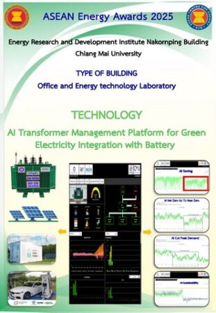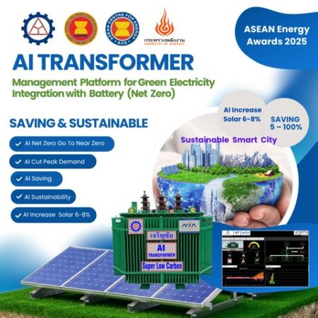 ASEAN Energy Awards 2025 ด้วย Platform AI เพิ่มกำลังผลิตโซลาร์เก่า 6-8% , Saving 5-100% ด้านความเสถียรภาพ ของระบบไฟฟ้า หม้อแปลงดังกล่าว AI Transformer Management Platform for Green Electricity Integration with Battery บริหารจัดการพลังงานสะอาดสูงสุด (Platform AI บริหารจัดการ Solar กับ Energy Storage ด้วยหม้อแปลง IoT (Low Carbon) ประโยชน์สูงสุดและเสถียรภาพ พร้อมทำ AI Net Zero Go To Near Zero, AI Cut Peak Demand, AI Saving, AI Sustainability, AI Increase old Solar 6-8% และประหยัดค่าไฟฟ้า ใช้งานจริงและพิสูจน์จริงร่วมกับมหาวิทยาลัยเชียงใหม่ และมหาวิทยาลัยเทคโนโลยีพระจอมเกล้าธนบุรี โดยพัฒนาขึ้นเพื่อรองรับการบริหารจัดการหม้อแปลงไฟฟ้า (Transformer) ด้วยระบบ Platform AI ที่ช่วยเพิ่มประสิทธิภาพด้านความเสถียรภาพของระบบไฟฟ้าและความมั่นคงของระบบไฟฟ้า สะท้อนถึงความมุ่งมั่นของประเทศไทยในการผลักดันนวัตกรรมพลังงานสะอาดและเทคโนโลยีดิจิทัลสู่ระดับสากลอันเป็นส่วนหนึ่ง ของเป้าหมายการพัฒนาที่ยั่งยืน และการเปลี่ยนผ่านสู่พลังงานคาร์บอนต่ำในอนาคต อีกทั้งตอบโจทย์ด้านการประหยัดพลังงานและความมั่นคงในกลุ่มเป้าหมาย Data Center ภาคอุตสาหกรรม, โรงพยาบาล, มหาวิทยาลัย, ห้างสรรพสินค้า, โรงเรียน และบ้านเรือน เพื่อรองรับพลังงานสะอาดอย่างมั่นคงและเสถียรภาพสูงสุด อีกทั้งยังลดความสูญเสียพลังงานและค่าใช้จ่ายด้านพลังงานสอดคล้องกับความต้องการของผู้ใช้งานและราคาพลังงานในตลาด ช่วยลดการพลังงาน 15-20% ลดคาร์บอน 100 ล้านตันคาร์บอน (ลดค่าไฟฟ้าของผู้ประกอบการ) และเป็นการสนับสนุนแนวนโยบายของกระทรวงพลังงาน ในการรองรับความต้องการใช้พลังงานของไทยที่เพิ่มขึ้นในอนาคต โดยเฉพาะการคำนึกถึงการลดภาวะโลกร้อน และพลังงานคาร์บอนต่ำ