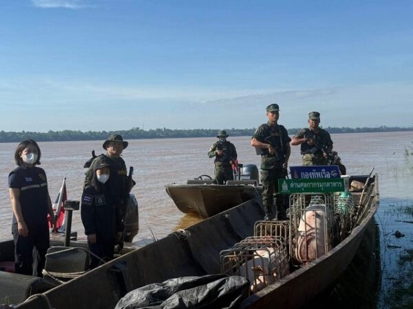 เมื่อวันที่ 17 มิถุนายน 2568 นาวาโท รุ่งเรือง มาสุทธิ หัวหน้าสถานีเรือมุกดาหาร ได้นำกำลังเจ้าหน้าที่ร่วมกับฝ่ายความมั่นคงในพื้นที่ ออกลาดตระเวนบริเวณบ้านหว้านน้อย ต.หว้านใหญ่ อ.หว้านใหญ่ จ.มุกดาหาร กระทั่งเวลา 05.30 น. ตรวจพบเรือเหล็กติดเครื่องยนต์ลำหนึ่ง ล่องมาจากฝั่ง สปป.ลาว เข้าจอดริมตลิ่งแม่น้ำโขง เจ้าหน้าที่จึงได้เข้าตรวจสอบพบชายฉกรรจ์ประมาณ 5 คน กำลังลำเลียงกรงเหล็กบรรจุสุกรมีชีวิต 7 กรง