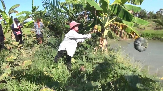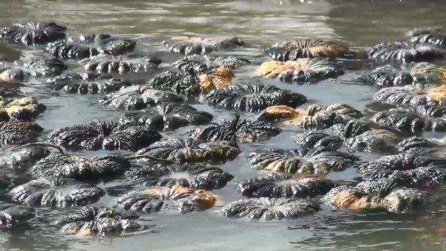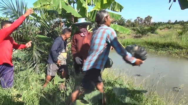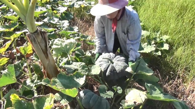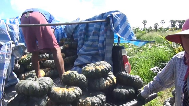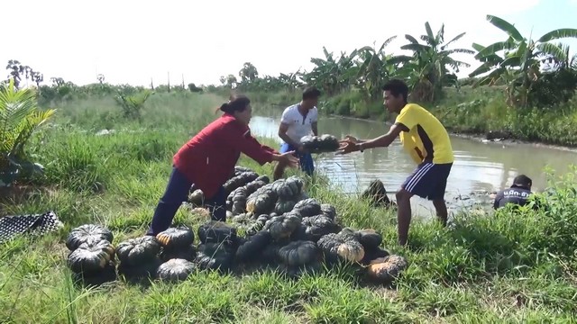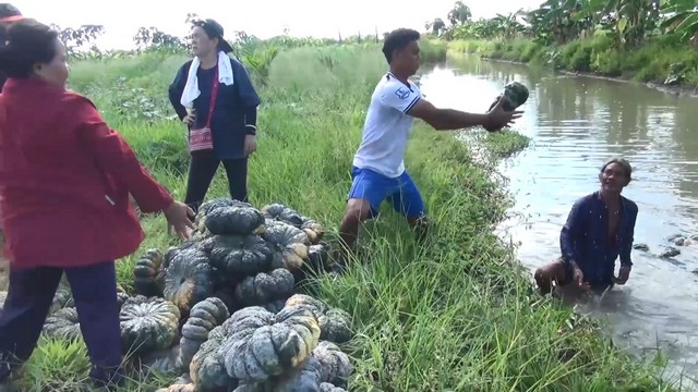 โดยใช้วิธีโยนลงคูน้ำข้างแปลงให้ลอยไปขึ้นรถที่มาคอยรับบริเวณหน้าแปลงปลูกฟักทองเพื่อส่งขาย โดยไม่ต้องขนให้หนัก เนื่องจากน้ำหนักฟักทองอยู่ที่ 3 – 7 กิโลกรัมต่อผล