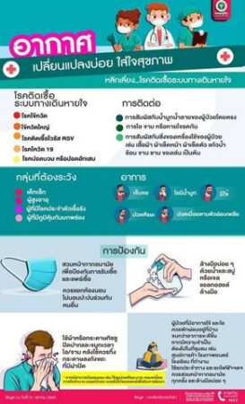 จากข้อมูลของกรมควบคุมโรค กระทรวงสาธารณสุข พบว่าในช่วงฤดูฝนมักพบการระบาดของกลุ่มโรคติดต่อระบบทางเดินหายใจเป็นส่วนใหญ่ โดยเฉพาะโรคโควิด 19 และไข้หวัดใหญ่ ซึ่งโรคระบบทางเดินหายใจส่วนใหญ่เกิดจากการติดเชื้อไวรัสหรือแบคทีเรีย สามารถแพร่กระจายได้ง่ายผ่านทางละอองฝอยจากการไอหรือจาม การสัมผัสกับสิ่งของที่ติดเชื้อ และการสัมผัสใกล้ชิดกับผู้ป่วย ซึ่งข้อมูลจากระบบเฝ้าระวังโรคดิจิทัล (Digital Disease Surveillance: DDS) กองระบาดวิทยา ตั้งแต่วันที่ 1 มกราคม – 22 พฤษภาคม 2568 มีผู้ป่วยไข้หวัดใหญ่ 338,352 ราย อัตราป่วย 521.25 ต่อประชากรแสนคน และมีรายงานผู้เสียชีวิต 44 ราย คิดเป็นอัตราป่วยตาย 0.013 กลุ่มอายุที่พบอัตราป่วยสูงสุด ได้แก่ อายุ 5 – 9 ปี รองลงมาเป็นกลุ่มอายุ 0 – 4 ปี และกลุ่มอายุ 10 – 14 ปี ตามลำดับ โดยข้อมูลจากการเฝ้าระวังเชื้อก่อโรคไข้หวัดใหญ่ พบว่า เชื้อที่เป็นสาเหตุการระบาดส่วนใหญ่เป็นเชื้อไวรัสไข้หวัดใหญ่ชนิด A/H1N1 (2009) ส่วนโรคโควิด 19 ตั้งแต่วันที่ 1 มกราคม – 22 พฤษภาคม 2568 พบผู้ป่วยสะสม 149,190 ราย อัตราป่วย 229.83 ต่อประชากรแสนคน มีรายงานผู้เสียชีวิต 31 ราย อัตราป่วยตาย ร้อยละ 0.02 กลุ่มที่พบอัตราป่วยต่อประชากรแสนคนสูงสุด 3 อันดับแรก ได้แก่ อายุ 0 – 4 ปี (375.44) รองลงมาเป็นกลุ่มอายุ 30 – 39 ปี (346.05) และกลุ่มอายุ 20 – 29 ปี (319.37) ตามลำดับ