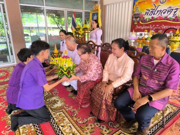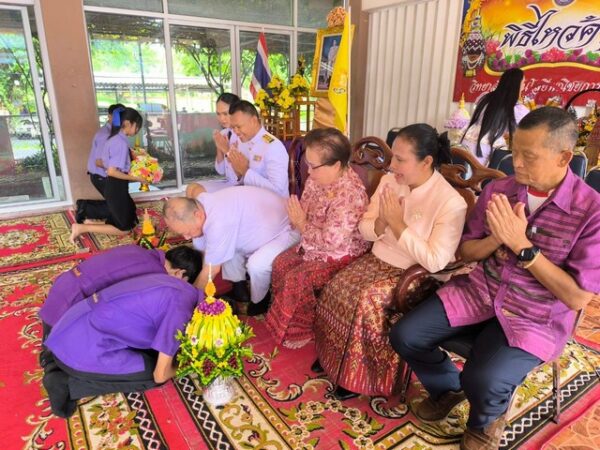 โดยมีคณะครู อาจารย์ และนักเรียน นักศึกษาได้นำพานดอกไม้ธูปเทียนตบแต่งให้เข้ายุกเข้าสมัยของนักเรียน นักศึกษา แต่ละชั้นเรียนเพื่อมากราบไหว้ครูบาอาจารย์ โดยเชิญ รศ.ดร. ประยุทธ์ ศุขวัฒน์ (อาจารย์พ่อ)ประธานในพิธีเจิมอุปกรณ์การเรียน จากนั้นตัวแทนนักเรียนนักศึกษาได้กล่าวคำบูชาครู ปฏิญาณตน และร้องเพลงพระคุณที่สาม จากนั้นตัวแทนนักเรียน นักศึกษาได้ถือพานที่จัดมาเข้าไหว้ครูเป็นอันเสร็จพิธี