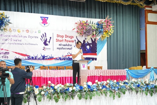 ที่อาคารอเนกประสงค์ โรงเรียนอนุบาลขอนแก่น อ.เมือง จ.ขอนแก่น หน่วยงานภาครัฐและเอกชนร่วมกิจกรรมตามโครงการมหกรรมวันต่อต้านยาเสพติดโลก 26 มิถุนายน 2568 ภายใต้แนวคิด “Stop Drugs Start Power สร้างพลังไทย หยุดภัยยาเสพติด” โดยมีนายประจวบ รักแพทย์ รองผู้ว่าราชการจังหวัดขอนแก่น เป็นประธาน นายประจวบ ศิริภักดิ์ ผู้อำนวยการโรงเรียนอนุบาลขอนแก่น กล่าวรายงานกิจกรรม