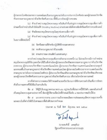 ขณะที่ในประกาศฉบับใหม่นี้ยังระบุห้ามจำหน่ายกัญชาผ่านตู้ขายสินค้าอัตโนมัติ แพลตฟอร์มออนไลน์ และในสถานที่สาธารณะ เช่น วัด สวนสาธารณะ สวนสัตว์ รวมถึงห้ามโฆษณากัญชาทุกช่องทาง เว้นแต่ใช้ตามคำสั่งแพทย์ โดยจำกัดปริมาณการใช้รักษาไม่เกิน 30 วัน