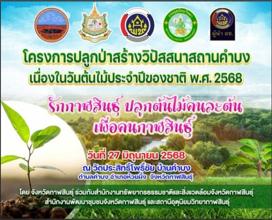 อย่างไรก็ตามในวันพรุ่งนี้ 27 มิถุนายน 2568 จะมีการจัดกิจกรรมโครงการปลูกป่าสร้างวิปัสสนาสถานคำบง เนื่องในวันต้นไม้ประจำปีของชาติ พ.ศ.2568 “รักกาฬสินธุ์ ปลูกต้นไม้คนละต้น เพื่อคนกาฬสินธุ์” เพื่อพื้นที่สีเขียว ที่วัดประสิทธิ์โพธิ์ชัย บ้านคำบง ต.คำบง อ.ห้วยผึ้ง จ.กาฬสินธุ์ อีกด้วย