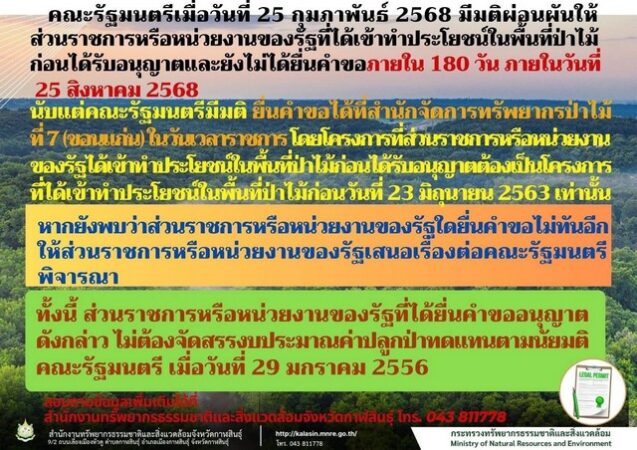 เพราะหากยื่นคำขอไม่ทันภายในวันที่ 25 สิงหาคม 2568 ส่วนราชการหรือหน่วยงานรัฐนั้น จะต้องเสนอเรื่องต่อคณะรัฐมนตรีพิจารณาเอง  ทั้งนี้หากส่วนราชการหรือหน่วยงานรัฐที่ได้ยื่นคำขออนุญาตดังกล่าวแล้วไม่ต้องจัดสรรงบประมาณค่าปลูกป่าทดแทนตามนัยมติคณะรัฐมนตรีเมื่อวันที่ 29 มกราคม 2556 อีกด้วย