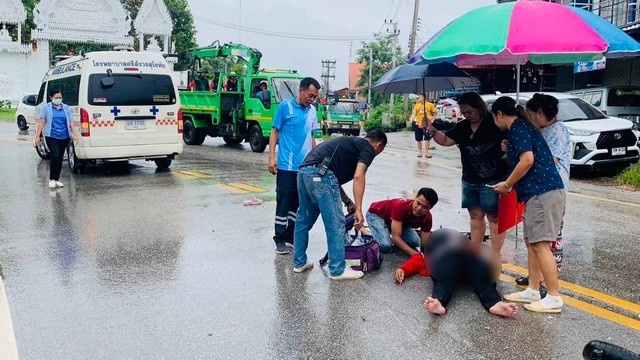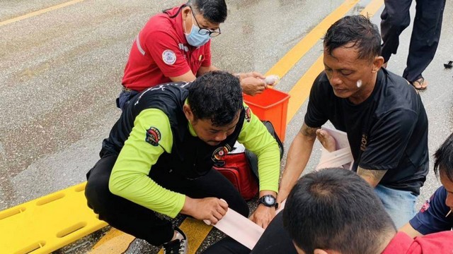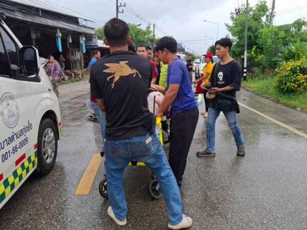 เจ้าหน้าที่กู้ภัยเร่งให้การปฐมพยาบาลเบื้องต้นในจุดเกิดเหตุ ท่ามกลางสายฝนที่ตกลงมาอย่างต่อเนื่อง ก่อนนำส่งตัวผู้บาดเจ็บไปยังโรงพยาบาลพิษณุเวช อุตรดิตถ์ ตามคำร้องขอของญาติที่เดินทางมาถึงที่เกิดเหตุในภายหลัง