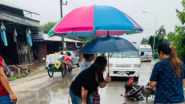 จากการสอบถามในเบื้องต้นทราบว่า ผู้บาดเจ็บได้ขับขี่รถจักรยานยนต์มาด้วยความเร็วสูง เมื่อถึงจุดแยกหน้าวัดไผ่ล้อม เกิดพุ่งชนเข้ากับรถกระบะที่แล่นมาจากอีกฝั่งของถนน ส่งผลให้ร่างของหญิงคนดังกล่าวกระเด็นตกจากรถได้รับบาดเจ็บสาหัส