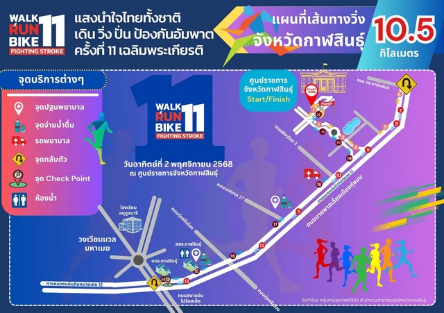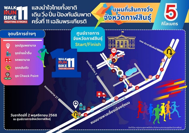 สสจ.กาฬสินธุ์เชิญชวนประชาชนร่วมกิจกรรม เดิน วิ่ง ปั่น ป้องกันอัมพาต ครั้งที่ 11 ในวันอาทิตย์ที่ 2 พฤศจิกายน 2568 พร้อมเปิดระบบลงทะเบียนรับสมัครออนไลน์แล้ว พร้อมกันทั้งประเทศ ระหว่างวันที่ 26 พฤษภาคม – 31 สิงหาคม 2568