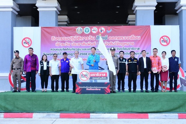 ที่บริเวณด้านหลังศาลากลางจังหวัดนราธิวาส อ.เมืองนราธิวาส ว่าที่ร้อยตรี ตระกูล โทธรรม ผู้ว่าราชการจังหวัดนราธิวาส เป็นประธานปล่อยแถวปฏิบัติการวันดีเดย์ออกตรวจ เตือน เฝ้าระวังประชาสัมพันธ์ และบังคับใช้กฎหมายควบคุมผลิตภัณฑ์ยาสูบ และเครื่องดื่มแอลกอฮอล์ เพื่อแสดงเจตจำนงและเฝ้าระวัง ประชาสัมพันธ์ และบังคับใช้กฎหมาย ที่เกี่ยวข้องกับผลิตภัณฑ์ยาสูบ บุหรี่ไฟฟ้า และเครื่องดื่มแอลกอฮอล์ อย่างเข้มข้น กิจกรรมครั้งนี้ดำเนินการพร้อมกันทั้ง 13 อำเภอของจังหวัดนราธิวาส โดยมี นายแพทย์สาธารณสุขจังหวัดนราธิวาส รองผู้อำนวยการกองงานควบคุมยาสูบ กรมควบคุมโรค กระทรวงสาธารณสุข ตลอดจนหัวหน้าส่วนราชการ ภาคีเครือข่ายทุกภาคส่วน เยาวชนชมรม Gen Z และผู้เกี่ยวข้องเข้าร่วมกิจกรรมฯ