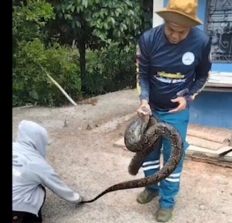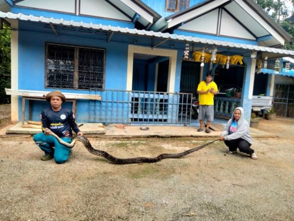 สงขลา-เจ้าบ้านหาแมวหลายตัว เจองูเหลือมยาวเกือบ 5 เมตร นอนขดตัวอยู่ใต้ถุน ชัดเจน อิ่มเพราะแมว