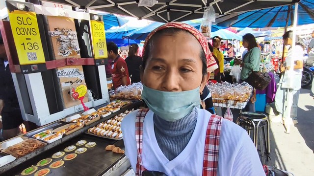 คุณจีรนันท์ แก่นทอง กล่าวว่า วันนี้ขาย ขนมเบื้อง โตเกียว ถังแตก ขนมเบื้องชิ้นละ 2 บาท ถ้าเป็นชิ้นฟูๆชิ้นละ 4 บาท ส่วนขนมถังแตก ชิ้นละ 10 บาททุกไส้เลย จะเป็นฝอยทองครีม ชิ้นละ 10 บาทเหมือนกัน มาขายที่ตลาดนัด วันอาทิตย์ ลูกค้ายังเหมือนเดิม ยอดขายก็ยังเหมือนเดิม ตอนนี้ อะไรๆมันก็ขึ้นราคา แต่เราก็ยังขาย 10 บาทเหมือนเดิม คือบางที คนเรา มีตังค์ 20 บาท ก็อิ่ม ได้ กินกับกาแฟแก้วนึงก็อยู่แล้ว คือขายเอากำไรไม่มาก แต่ขอให้มีงานทำก็พอ ตอนนี้ขายอยู่ 2 แห่ง คือที่นี่ ตลาดนัดรถไฟ กับที่ ตลาดวชิราสตรีทฟู้ด ก็เลยต้องหยุดขายที่ตลาดประชารัฐ และสี่แยกวัดดอนรักที่เคยขายประจำก็ต้องหยุดก่อน ตอนนี้ ก็ขายที่วชิรา Street food และตรงนี้ ตลาดนัดรถไฟวันอาทิตย์วันเดียว ที่ตลาด Street food หยุดวันศุกร์ วันเสาร์ 2 วัน