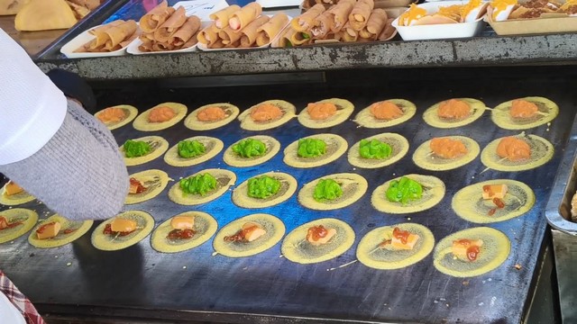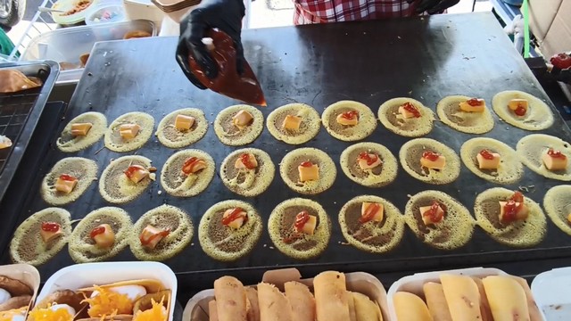 -ขนมเบื้องราคาชิ้นละ 2 บาท แต่ก็มีไส้ให้เลือก ทั้งไส้ฝอยทอง ฝอยใบเตย เค็มกุ้ง มะพร้าว ช็อกโกแลต-เรนโบว์