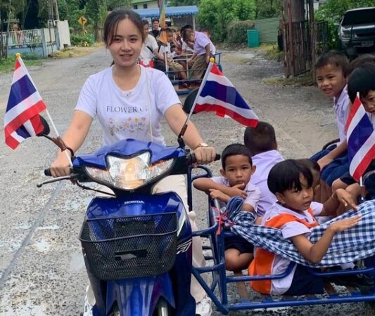โดยมีนักเรียนแต่งชุดนางรำมาเดินรำหน้าขบวนเป็นการสร้างสีสัน ส่วนนักเรียนบางคนนั่งรถจักรยานยนต์พ่วงข้างได้ยินเสียงเพลงอดทนไม่ไหวลุกขึ้นมาเต้นกันอย่างสนุกสนาน เพื่อมุ่งหน้ามาถวายเทียนพรรษา ณ วัดบ้านดง ตำบลสาริกา อำเภอเมือง จังหวัดนครนายก