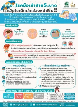 สำหรับสถานการณ์โรคมือเท้าปาก ณ วันที่ 1 กรกฎาคม 2568 มีรายงานผู้ป่วยสะสม 24,008 ราย กลุ่มอายุที่พบมากที่สุด คือ เด็กแรกเกิดถึง 4 ปี จำนวน 17,739 ราย ซึ่งมีมากกว่าร้อยละ 70 ของผู้ป่วยทั้งหมด รองลงมา คือ กลุ่มเด็กอายุ 5 – 9 ปี (ร้อยละ 22.0) และกลุ่มอายุ 10 – 14 ปี (ร้อยละ 2.5) ตามลำดับ