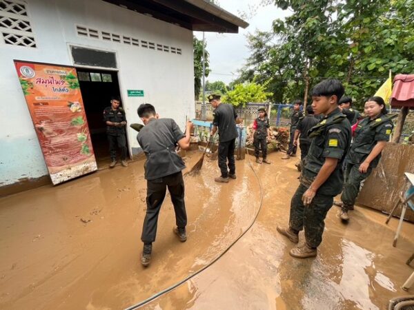 ลำปาง-“รด.จิตอาสา เราทำความดีด้วยหัวใจ” นศท.ปี 3 รร.ประชารัฐธรรมคุณ ร่วมฟื้นฟูพื้นที่ประสบอุทกภัย อ.งาว