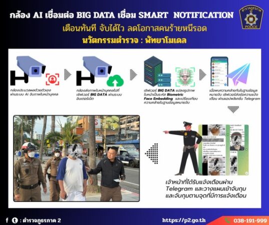 พล.ต.ท.ยิ่งยศ กล่าวด้วยว่า ตำรวจภูธรภาค 2 เราเล็งเห็นว่าความมั่นใจในความปลอดภัยเป็นหัวใจของการท่องเที่ยวในยุคปัจจุบัน เราต้องสร้างเมืองท่องเที่ยวของไทย โดยเลือก “พัทยา” ซึ่งเป็นจุดหมายสำคัญของนักท่องเที่ยวจากทั่วโลก เป็นพื้นที่ต้นแบบทำ พัทยาโมเดล ให้เป็นเมืองปลอดภัย น่าเที่ยวและน่าเชื่อถือ ตำรวจต้องปรับตัว คิดและลงมือทำแบบเชิงรุกสร้างความมั่นใจให้ได้ก่อนปัญหาเกิด ตำรวจภูธรภาค 2 ได้ประสาน เมืองพัทยา และกองบัญชาการตำรวจสอบสวนกลางสร้างข้อมูลบิ๊กดาต้าครบวงจร มีฐานข้อมูลบุคคลต้องสงสัย บุคคลเฝ้าระวัง และบุคคลตามหมายจับ ทำแผนที่ความเสี่ยง หรือ CRIME MAPPING เชื่อมต่อกล้องวงจรปิดอัจฉริยะใน 5 จุดในพื้นที่แซนด์บ็อกซ์ โดยเลือกสถานที่ 3 แห่ง 5 จุดสำคัญ คือ 1.ชายหาดพัทยา 2 จุด 2.วอล์กกิ้งสตรีท 2 จุด และ 3. ท่าเทียบเรือแหลมบาลีฮาย 1 จุด มีฟังก์ชันตรวจจับใบหน้าบุคคล หรือ FACE RECOGNITION แบบเรียลไทม์ ทั้งนี้เป็นระบบที่ใช้งานง่าย เคลื่อนที่ได้สามารถปรับใช้ในอีเว้นต์ต่าง ๆ ได้ โดยมีระบบ Smart Notification แจ้งเตือนทันทีไปยังเจ้าหน้าที่ สามารถจับได้ไว ลดโอกาสคนร้ายหนีรอด ตั้งแต่ติดตั้งระบบนี้สามารถจับกุมบุคคลตามหมายจับได้หลายรายได้เร็วขึ้นหลายเท่า