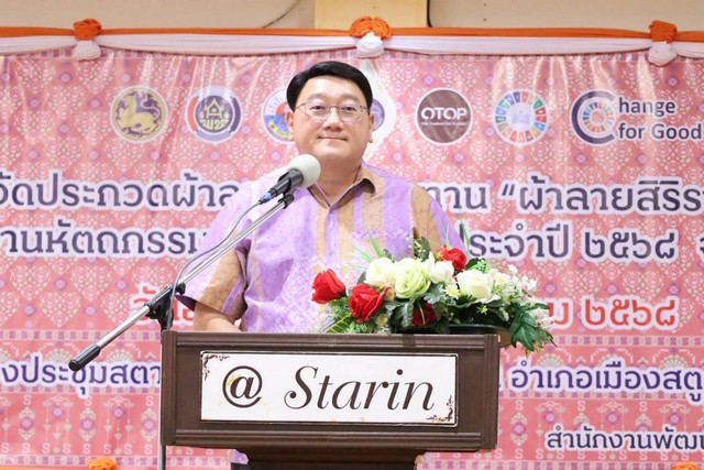 วันนี้ 22 ก.ค. 68 ที่สตารินทร์รีสอร์ท ตำบลพิมาน อำเภอเมืองสตูล จังหวัดสตูล นายศักระ กปิลกาญจน์ ผู้ว่าราชการจังหวัดสตูล เป็นประธานเปิดโครงการประกวดผ้าลายพระราชทาน “ผ้าลายสิริราชพัสตราภรณ์” และงานหัตถกรรม ประจำปี พ.ศ. 2568 พร้อมด้วย ทันตแพทย์หญิงสุกีรติ กปิลกาญจน์ ประธานแม่บ้านมหาดไทยจังหวัดสตูล นายสุระชาติ พรหมดิเรก พัฒนาการจังหวัดสตูล หัวหน้าส่วนราชการ ข้าราชการ เจ้าหน้าที่ภาครัฐ ภาคเอกชน ผู้ผลิต ผู้ประกอบการ OTOP และประชาชนผู้สนใจเข้าร่วมงานอย่างพร้อมเพรียง การจัดประกวดในครั้งนี้ เป็นกิจกรรมภายใต้โครงการส่งเสริมภูมิปัญญาและวัฒนธรรมท้องถิ่น สู่การพัฒนาเศรษฐกิจฐานรากอย่างยั่งยืน