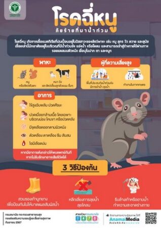 สถานการณ์โรคเลปโตสไปโรซิส (Leptospirosis) หรือโรคไข้ฉี่หนู ช่วงอายุที่พบมากที่สุดคือ กลุ่มอายุ 40 – 49 ปี อาชีพที่พบมากที่สุดคือ อาชีพรับจ้าง เกษตรกร ปัจจัยเสี่ยงส่วนมากพบในผู้ที่ลุยน้ำขัง ย้ำน้ำ หรือแช่น้ำนานๆ การดูแลป้องกันตนเอง เช่นการสวมใส่รองเท้าบูทขณะลุยน้ำ