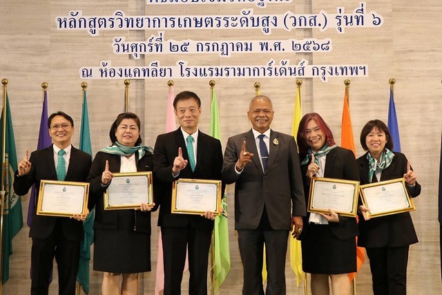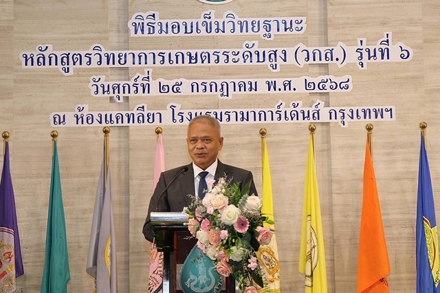 วันที่ 25 กรกฎาคม 2568 – กระทรวงเกษตรและสหกรณ์ ร่วมกับมูลนิธิเกษตราธิการ และสำนักงานพัฒนาการวิจัยการเกษตร (องค์การมหาชน) หรือ ARDA จัดพิธีมอบเข็มวิทยฐานะแก่ผู้สำเร็จหลักสูตรวิทยาการเกษตรระดับสูง (วกส.) รุ่นที่ 6 โดยได้รับเกียรติจากนายประยูร อินสกุล ปลัดกระทรวงเกษตรและสหกรณ์ เป็นประธานในพิธีฯ พร้อมมอบเข็มวิทยฐานะแก่ผู้เข้ารับการอบรมที่สำเร็จหลักสูตรฯ จำนวน 110 คน ซึ่งเป็นผู้บริหารระดับสูงจากหน่วยงานภาครัฐ เอกชน และเกษตรกร โดยมี นายอนันต์ สุวรรณรัตน์ ผู้อำนวยการหลักสูตรฯ นายชวลิต ชูขจร ประธานกรรมการ ARDA และ ดร.วิชาญ อิงศรีสว่าง ผู้อำนวยการ ARDA เข้าร่วมเป็นเกียรติและเป็นสักขีพยานในพิธี ณ ห้องแคทลียา โรงแรมรามาการ์เด้นส์ กรุงเทพฯ