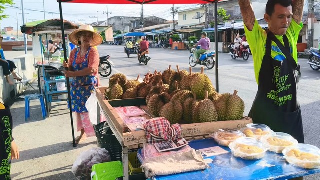 นางสุคนธ์ หรือป้าสาว แท่นแสง กล่าวว่า ที่มาขายทุเรียนในวันนี้ เนื่องจากเข้าฤดูผลไม้ รายได้ดีกว่า อีกทั้งช่วงนี้ทุเรียนออกเยอะ ราคาถูกกำไรดี โดยพ่อค้าจะมาส่งทุเรียนเป็นทุเรียนพันธุ์หมอนทองและชะนีจากจังหวัดยะลา โดยขายในราคา 80 -90 บาท อันนี้แล้วแต่ทุเรียนมาแต่ละรุ่น ลูกค้าก็มาเรื่อยๆ ทุเรียนที่สั่งมา จะขายหมดไม่มีตกค้าง เมื่อทุเรียนใกล้จะหมด พ่อค้าก็จะนำทุเรียนมาส่งใหม่อีก โดยจะมาส่งครั้งละประมาณ 300 กิโล เราก็ไม่กล้าสั่งมาเยอะเกินไป จะสั่งเที่ยวละประมาณ 300 กิโลเท่านั้น โดยมีลูกชาย มาช่วยขายด้วย ทุกวัน