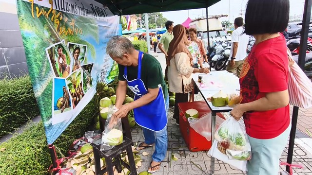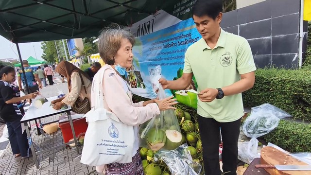 สงขลา-กลุ่มแปลงใหญ่มะพร้าวน้ำหอม ต.ชุมพล อ.สทิงพระ จ.สงขลา นำมะพร้าวน้ำหอมสดจากสวน มาออกบูธขายลูกละ 10 บาท และน้ำมะพร้าวไม่ใส่น้ำตาลเย็นๆ แก้วละ 15 บาท